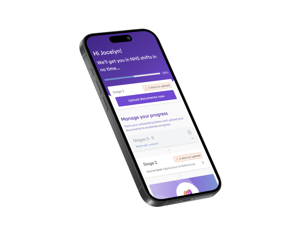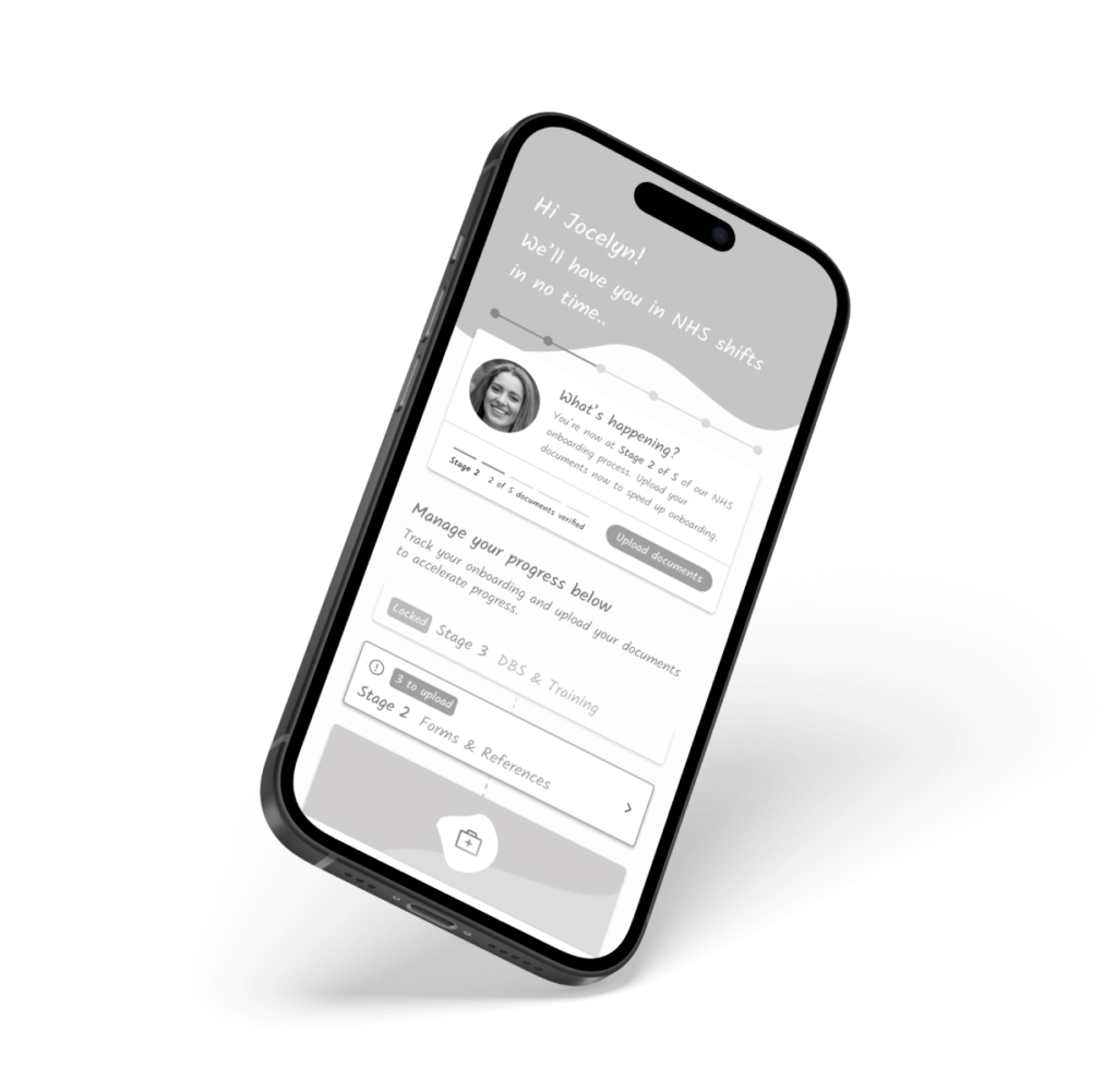 Prioritising speed, the initial solution involved repurposing our existing social care onboarding flow to accommodate NHS professionals. This flow was already incredibly document-heavy, and would be even more so for NHS, however urgency was paramount for the business. To address any issues, a dedicated Ops team was established in Birmingham to provide personalised guidance throughout the onboarding process. While functional, the Product team recognised the potential for a more user-centric solution – an app-driven onboarding experience that empowered professionals with greater control, transparency, and a smoother journey. And of course, less dependency on our Ops team.