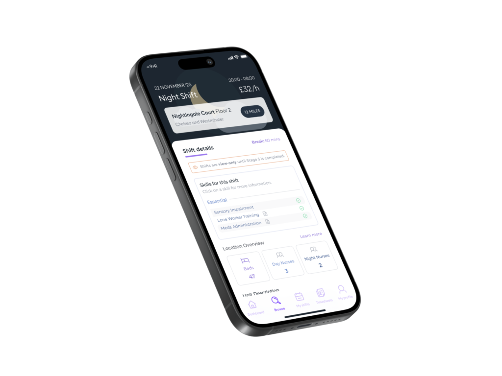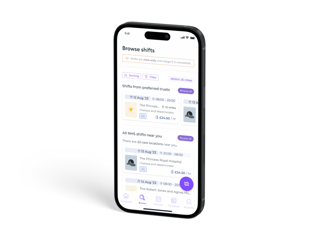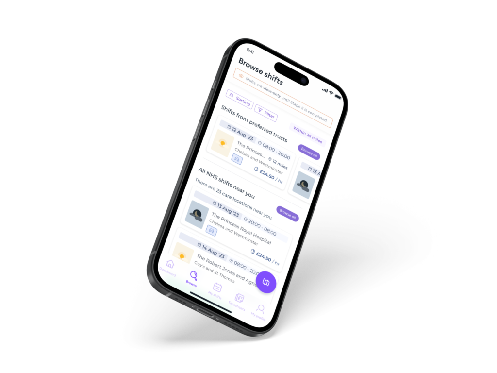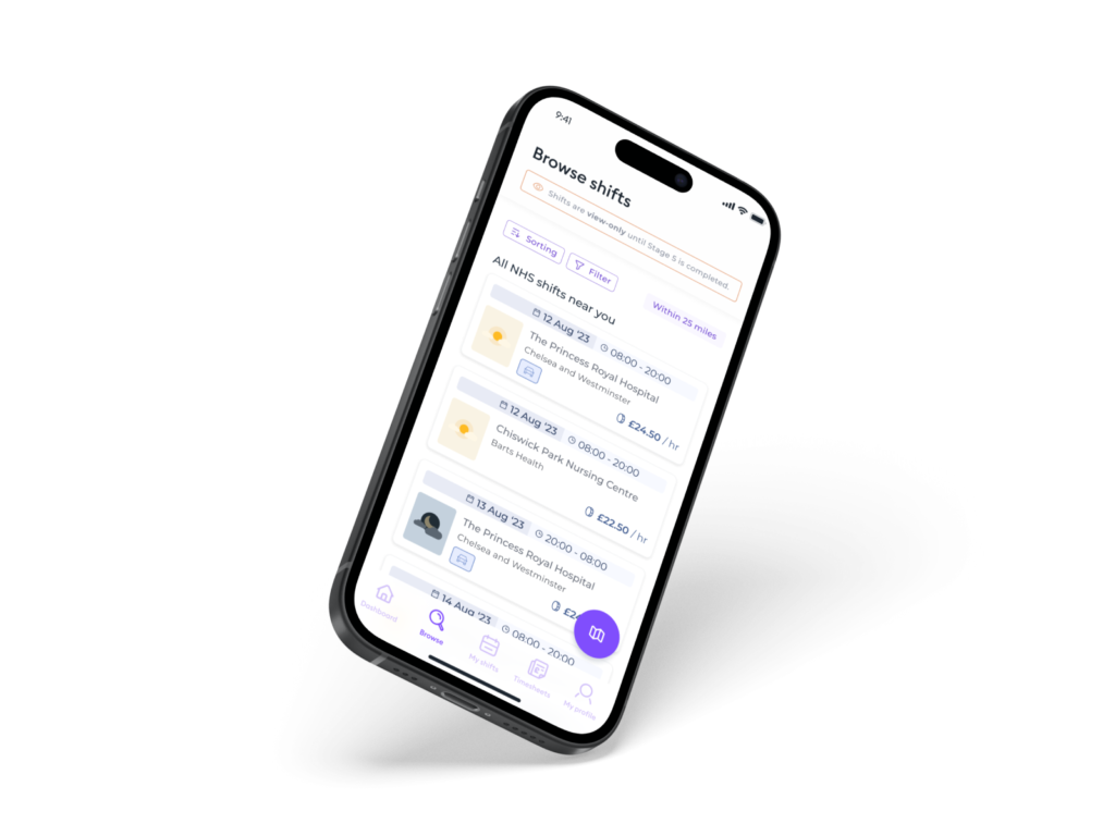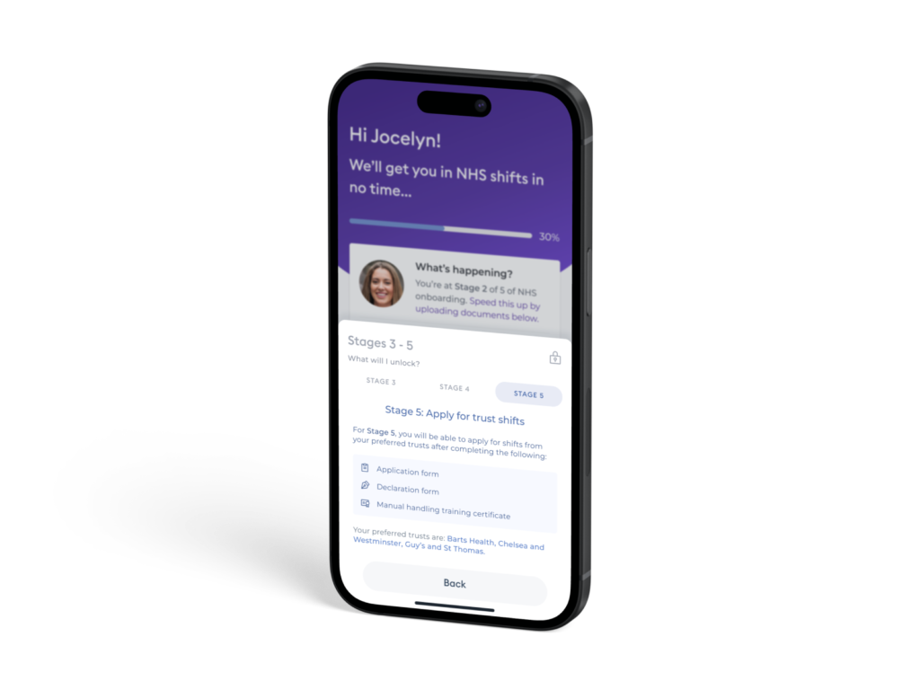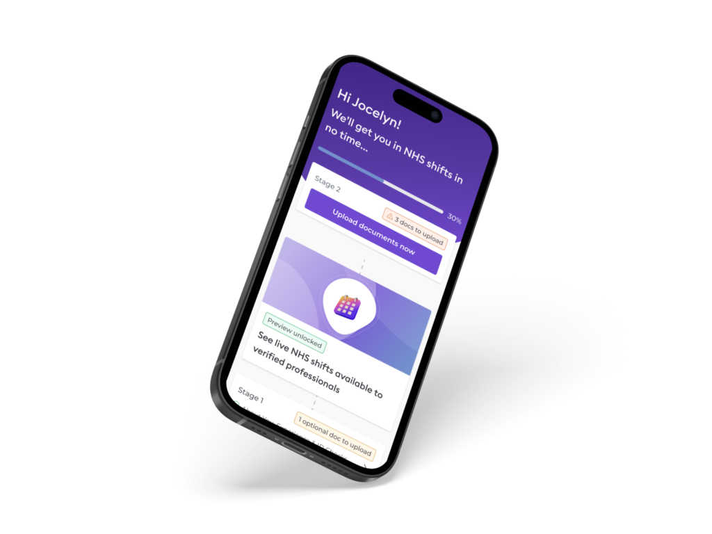 To incentivise completion and showcase the value proposition of Florence, professionals were granted access to view available shifts as they progressed through the onboarding stages.